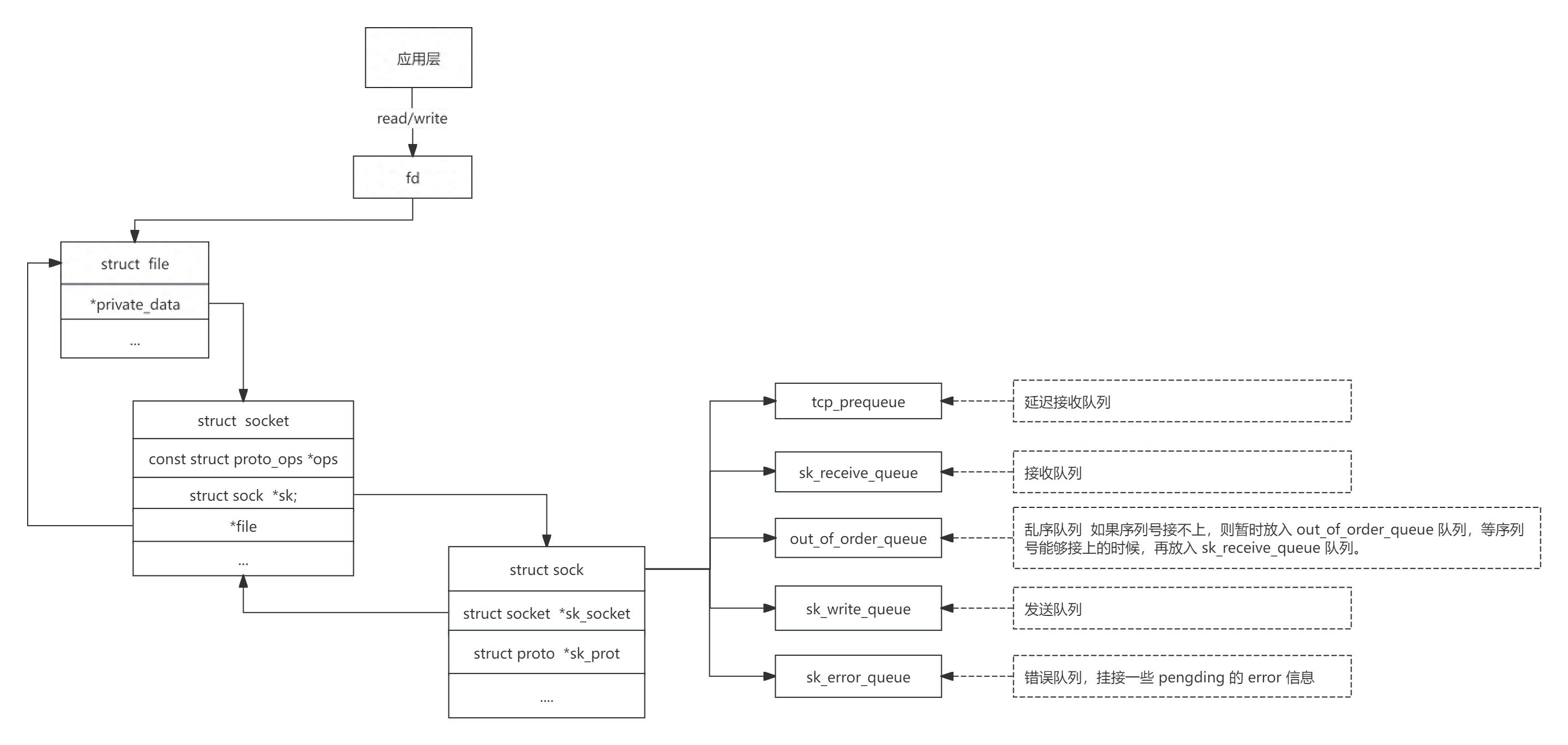 了解epoll机制前我们先熟悉下应用程序是怎么和内核协议栈关联的,这里涉及到几个结构: