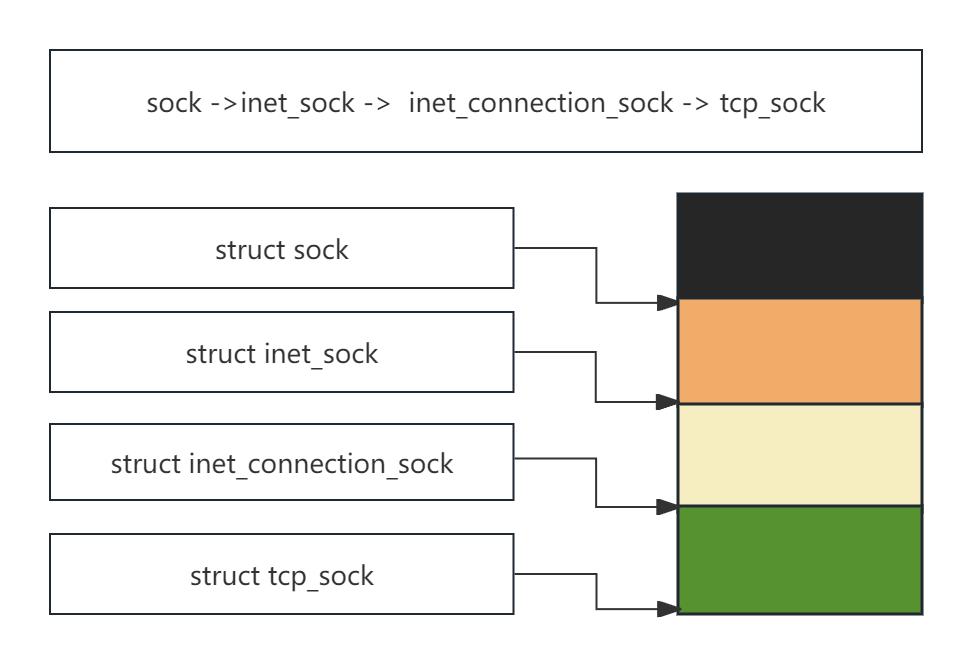 };sock:内核真正表示连接信息的结构,包含了类型、协议和各种操作函数,tcp的具体sock是tcp_sock,如下图通过sock ->inet_sock -> inet_connection_sock -> tcp_sock封装而来。