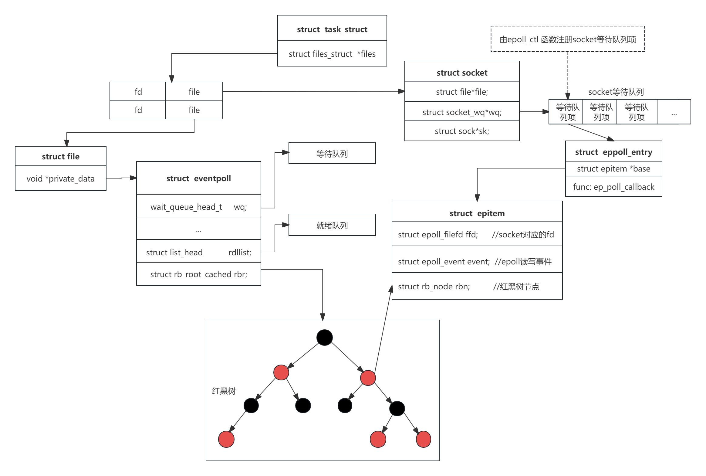 2:epoll_ctl:用于添加一个epoll事件,也就是添加socket到其需要管理的集合中,这个集合使用一个红黑树结构表示。