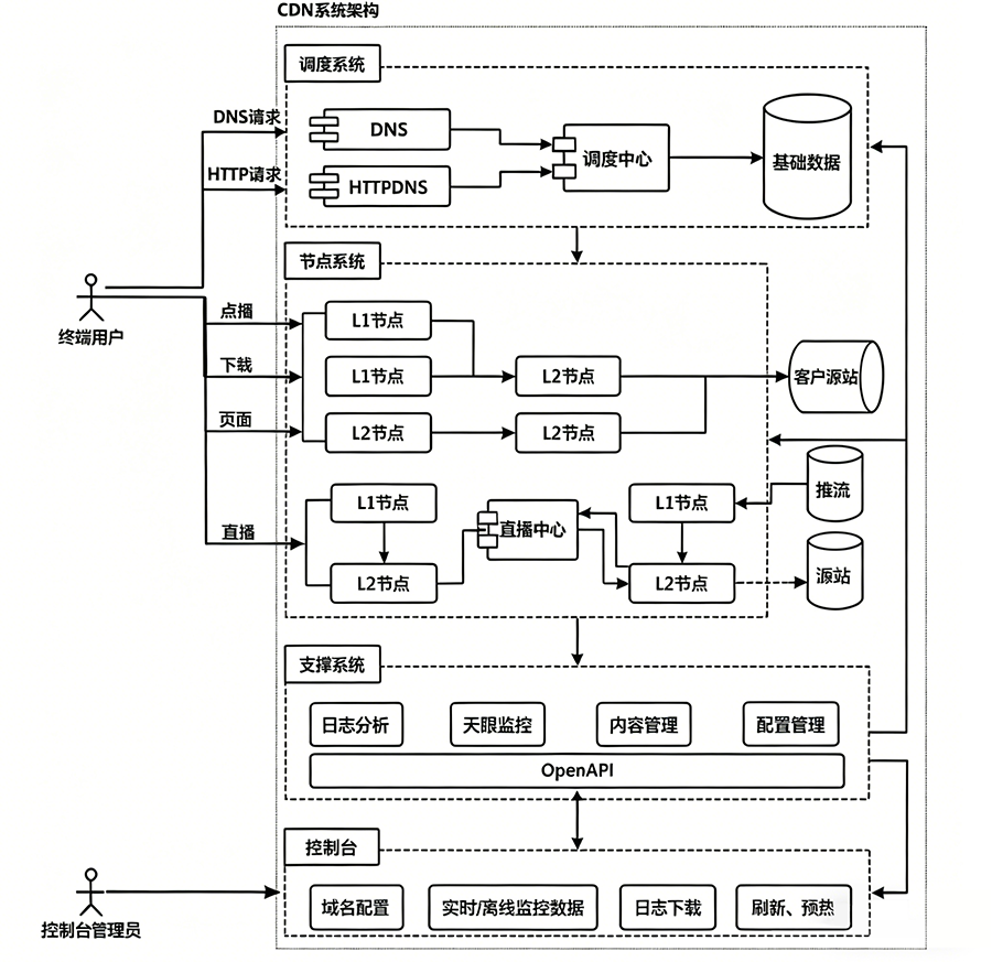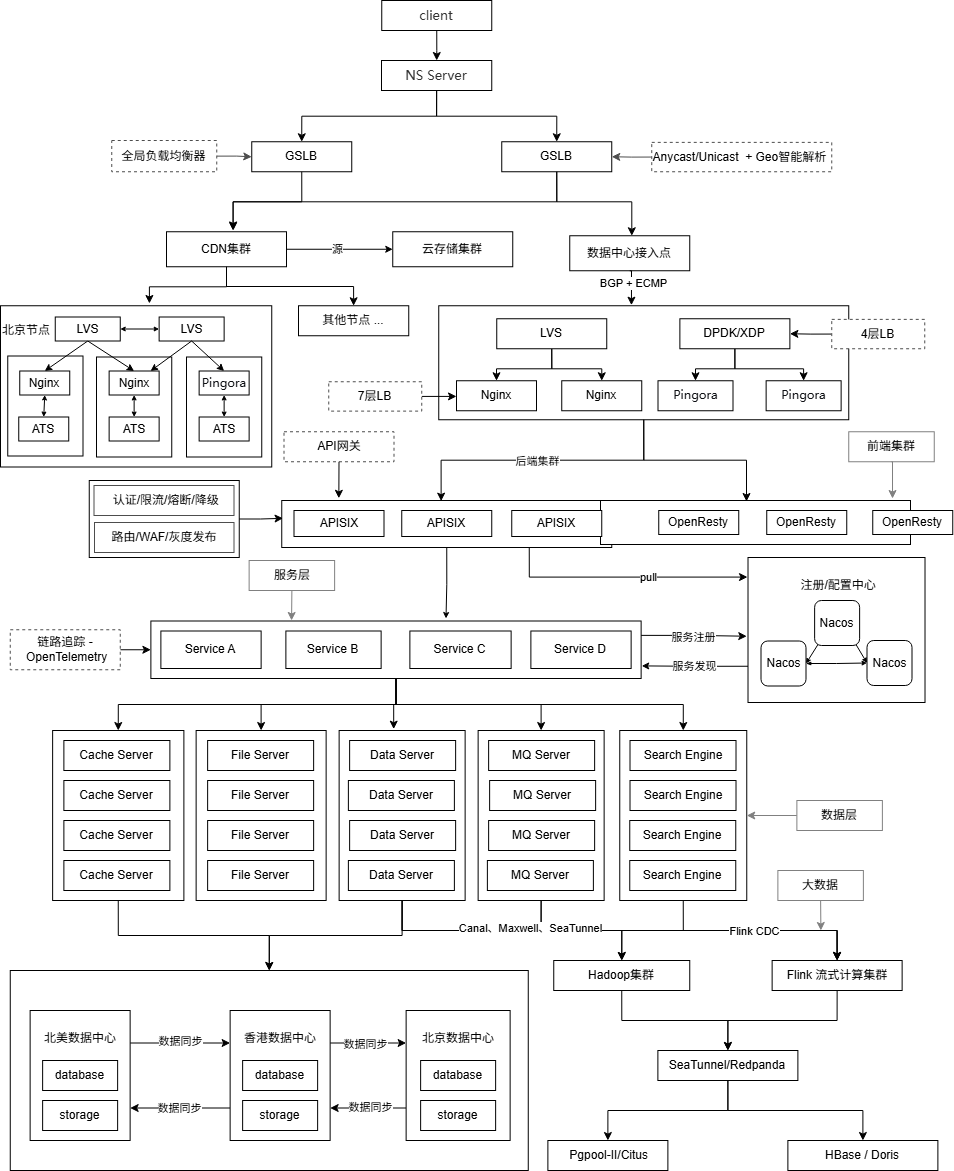 架构 - 服务端大型部署架构设计 2025-02-10 10:03:31 +0800 [原创] 目录 1. 大型服务端架构设计 2. HA主备/双主架构设计 3. 大型CDN集群架构设计 一、大型服务端架构设计: 1. 服务端整体架构: 2. 微服务整体架构: 二、HA主备/双主架构设计: 三、大型CDN集群架构设计: DNS 解析流转图 CDN节点架构 整体管理架构 四、负载均衡架构设计: 1. GSLB 全局负载均衡架构: 2. XDP + eBPF 4层LB架构: 五、API网关架构设计: 1. API Gateway Mesh: 2. 微服务 API Gateway:
