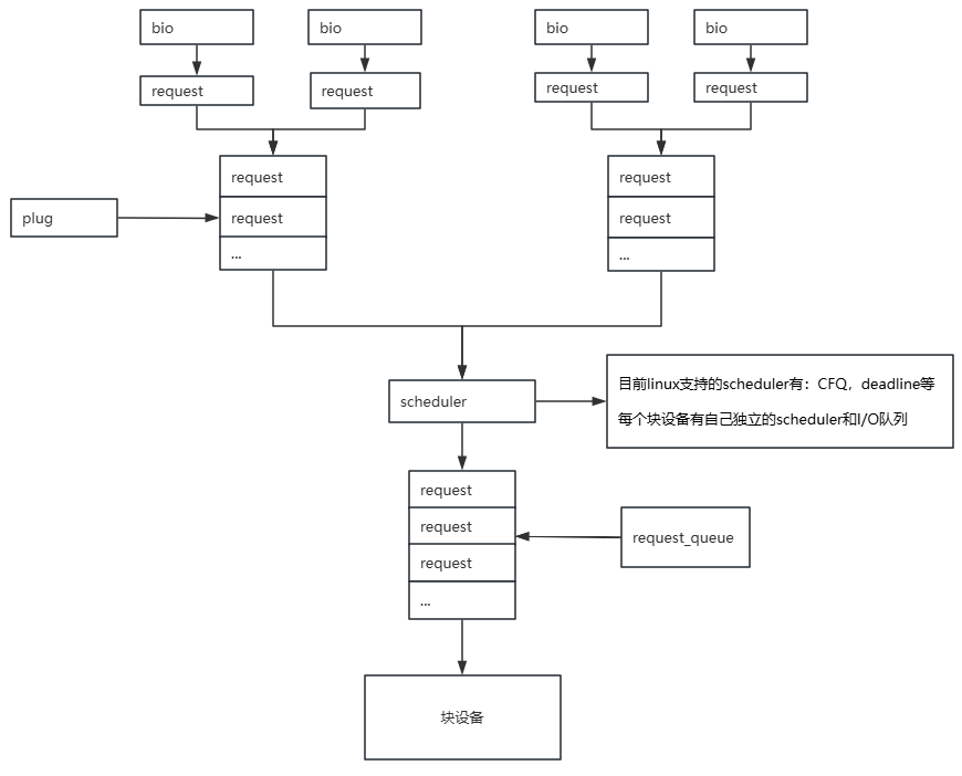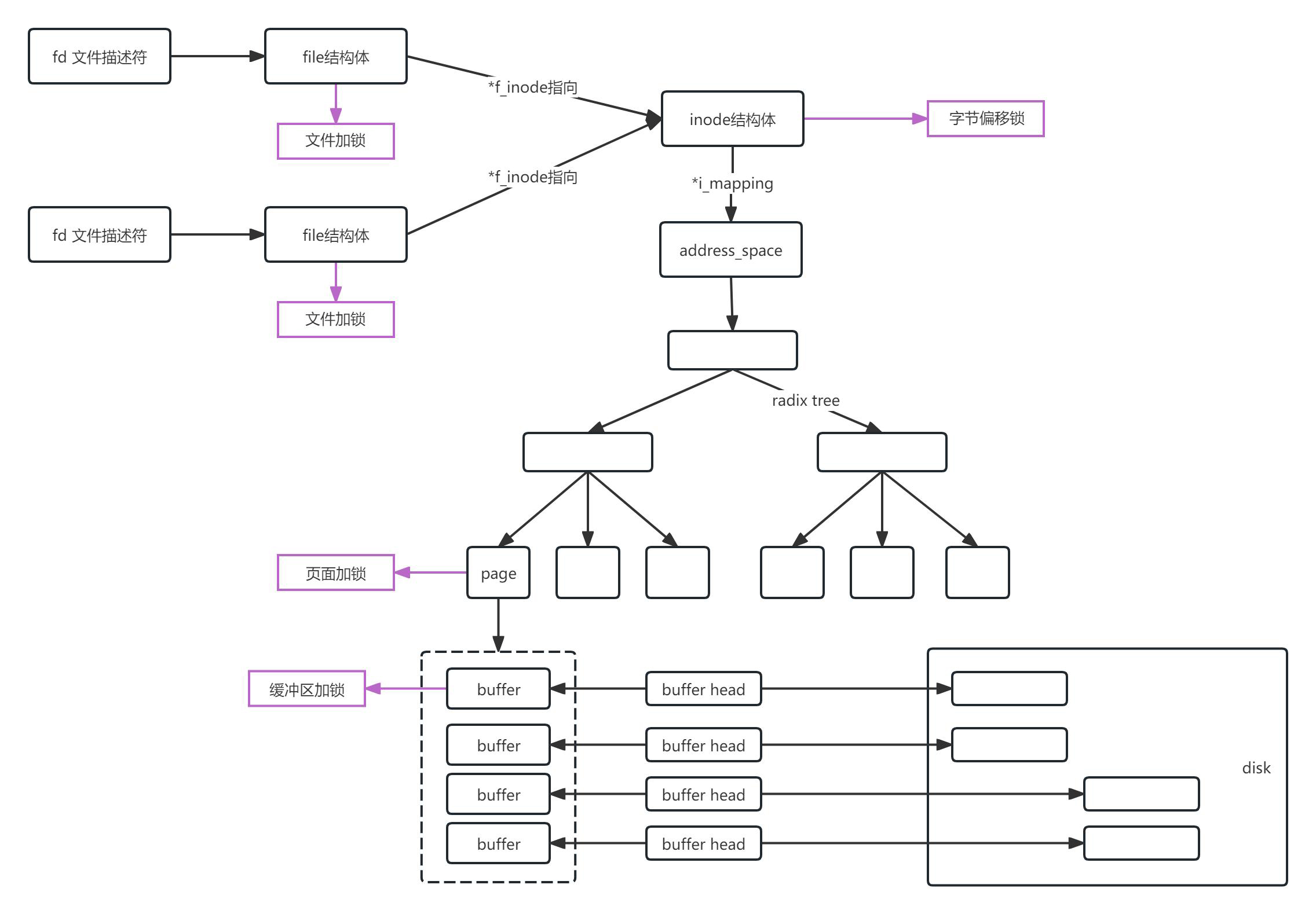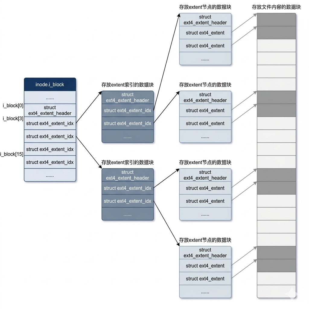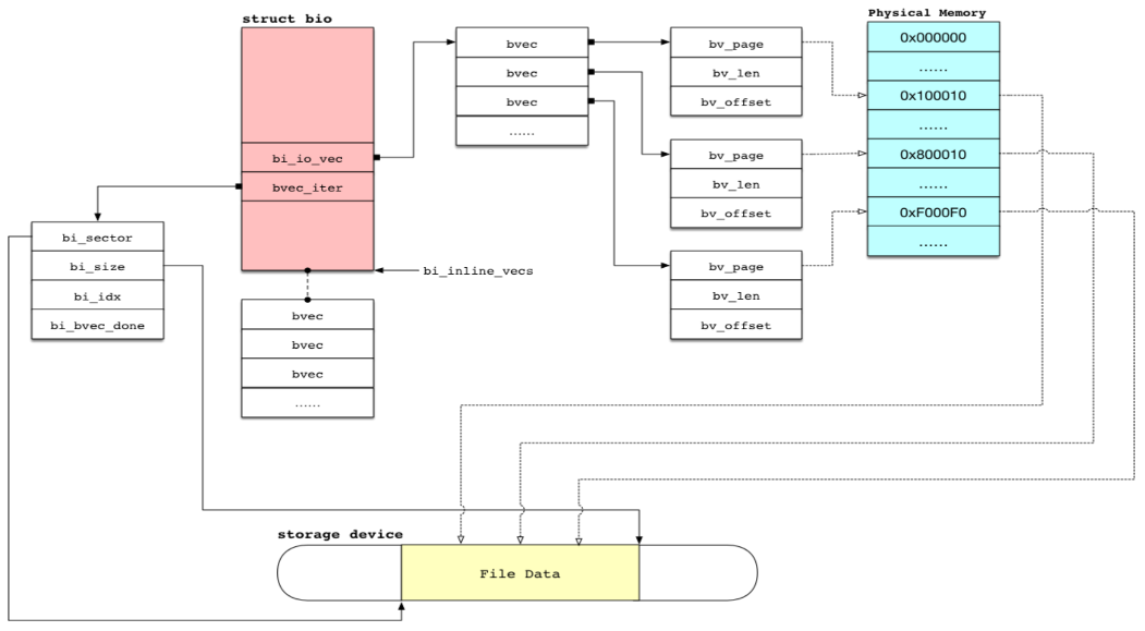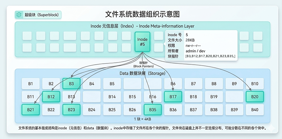 如上图,上面是inode部分,下面是data部分,inode中存储了文件所在各个块的指针,文件块在磁盘上并不一定连续分布,可能分散在不同的各个块中。当然这个只是基础的原理示意,实际的存储过程显然要复杂的多,不同的文件系统有不同的实现方式,比如ext3/4是通过多级索引和Extent组织索引,而xfs则是b+ tree的方式组织索引。