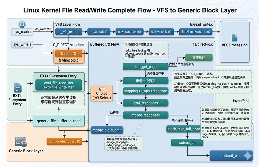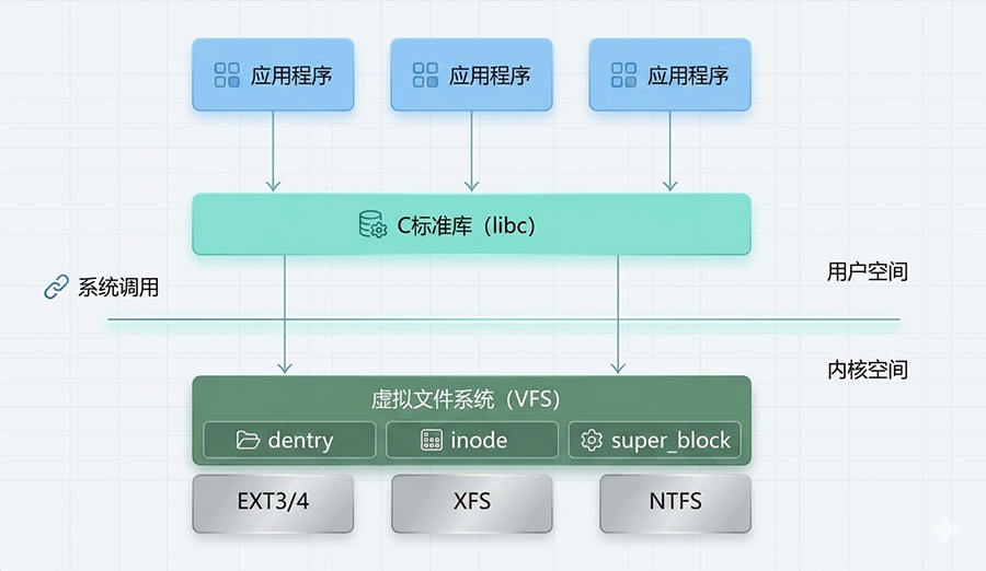 VFS是一个在具体的文件系统之上抽象的一层,用来处理与文件系统相关的所有调用,通过给各种文件系统提供一个通用的接口,从而屏蔽了底层不同文件系统之间的差异,使上层的应用程序能够使用一个通用的接口访问不同文件系统。