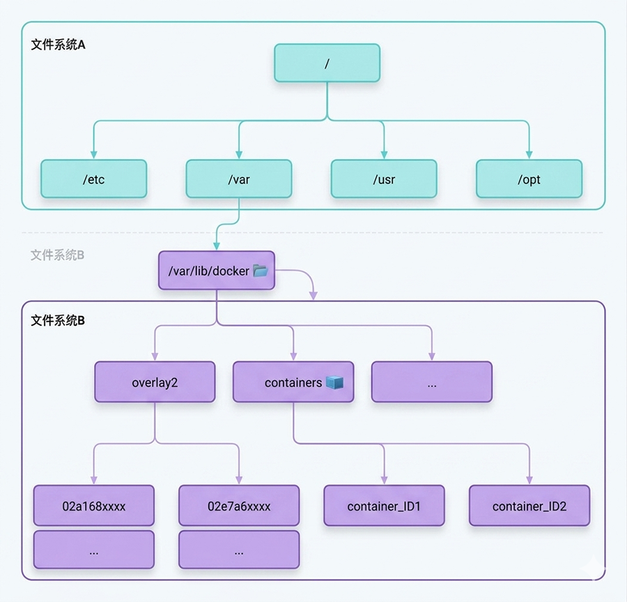 Linux可以把一个文件系统挂载到某个目录上,dentry是相对于文件系统来说的,每个dentry在其文件系统内dentry结构树上的位置是固定的,如上图,文件系统B挂载到文件系统A的/var/lib/docker目录,虽然containers可以通过/var/lib/docker/container路径访问,但containers的dentry结构在文件系统B对应的dentry结构树上的位置是固定的,不会随着文件系统B挂载到不同的位置而改变,也就是说dentry是相对于其所在的文件系统来说的。