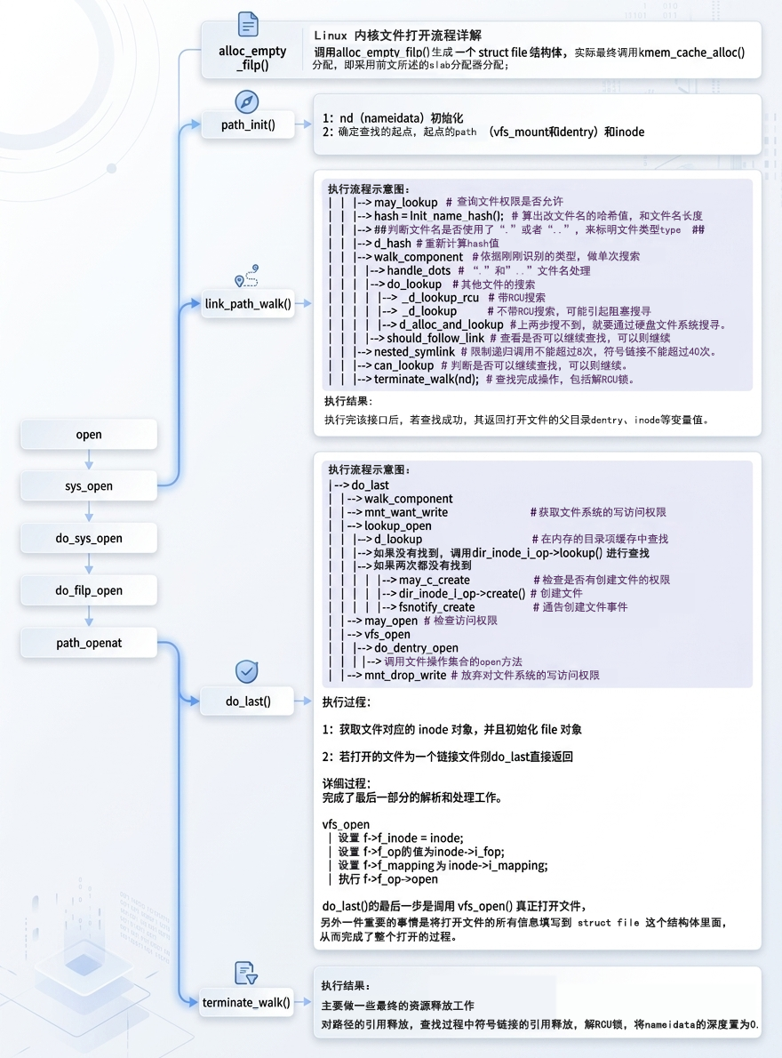 2. sys_open() 打开一个文件,如果文件不存在,dentry仍然会被创建且被加入到dcache中,但是dentry指向的inode为空(此时dentry为负状态),path_walk()完毕后,dentry被加入到super_block的LRU链表中,等待销毁.
