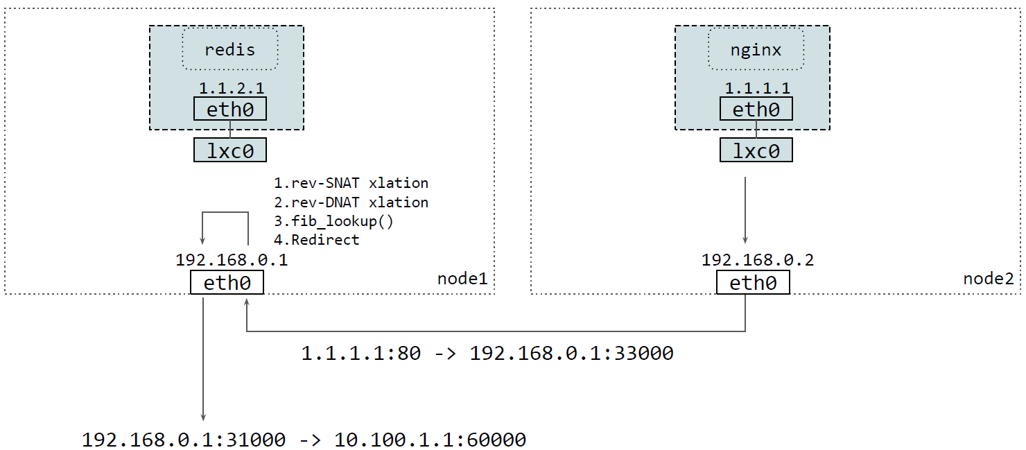 反向路径是类似的,也是回到这个 node,TC ingress BPF 先执行 rev-SNAT,然后 rev-DNAT,FIB lookup,最后再发送回客户端,