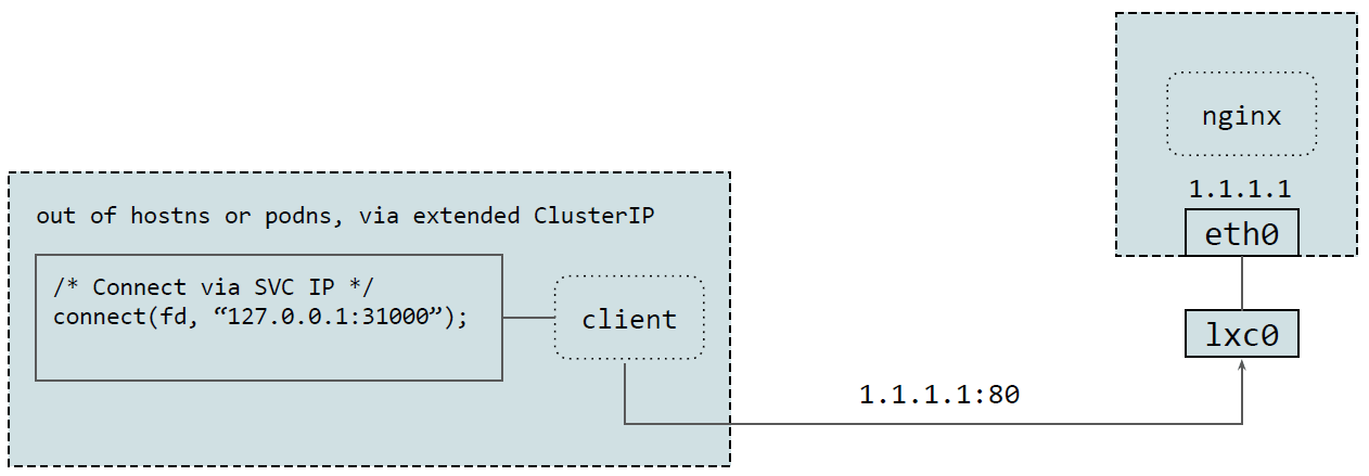 对于 ClusterIP,我们在 BPF 里拦截 socket 的 connect 和 send 系统调用;