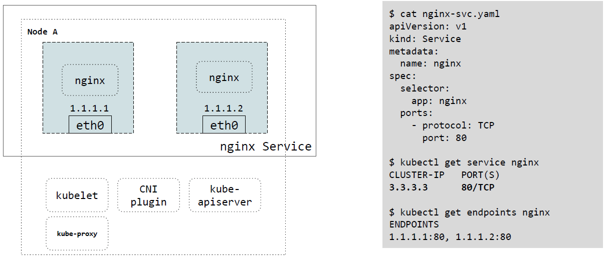 nginxService 的两个 backend pods(在 K8s 对应两个 endpoint),这里 位于同一台节点,每个 Pod 有独立的 IP 地址;- 查看: