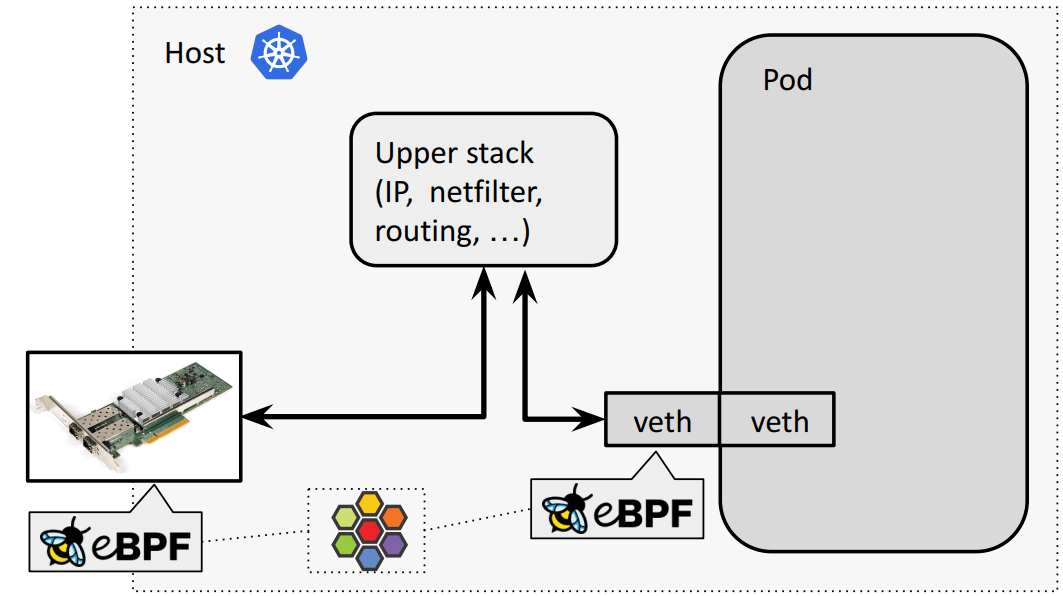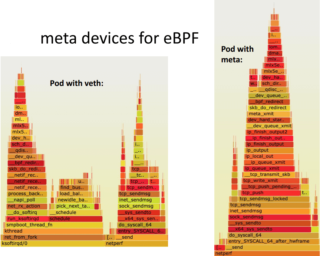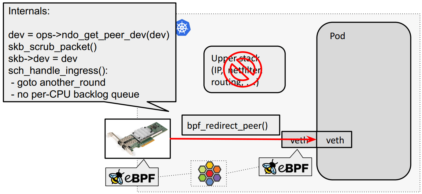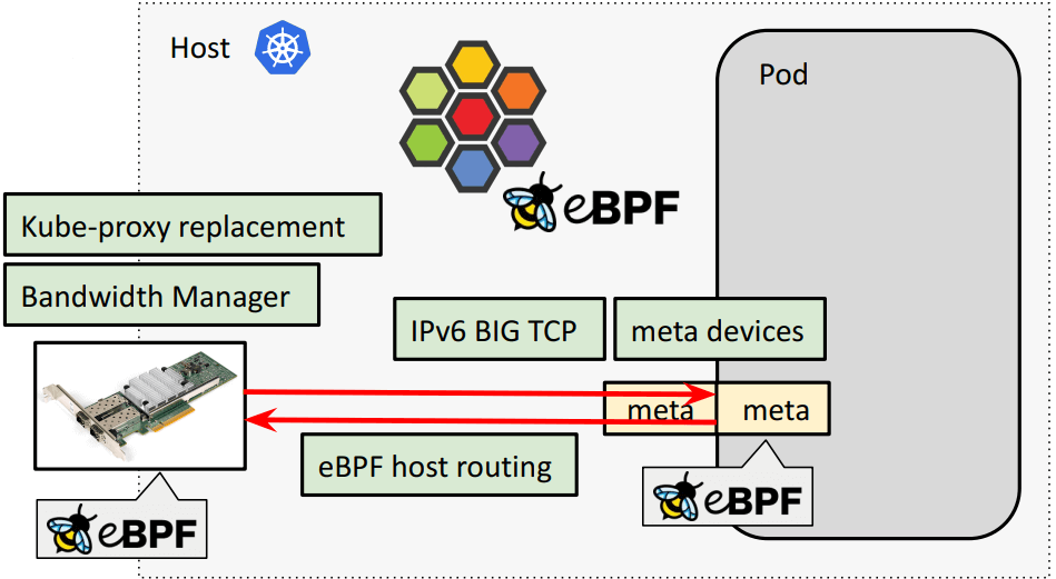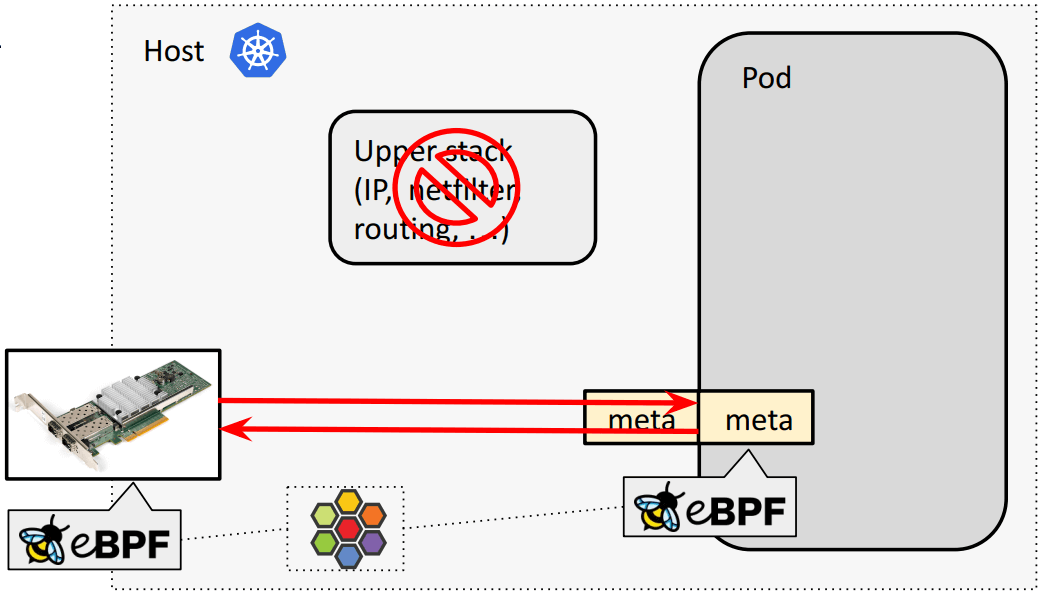 meta device,替代 veth pair 取得更极致的网络性能; - Cilium 的 eBPF 转发架构如何通过可编程的方式绕过(bypass)大部分无关的内核网络栈 (仍然基于内核网络栈,只是绕过无关部分,与 DPDK 等完全绕过内核的方式存在本质区别),显著提升网络性能。