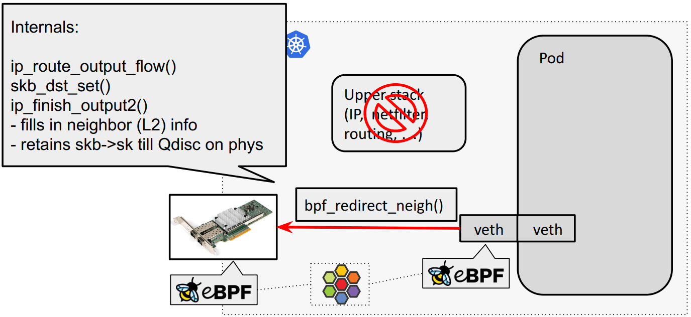 - Cilium’s eBPF prog called only on tc ingress to redirect to phys dev