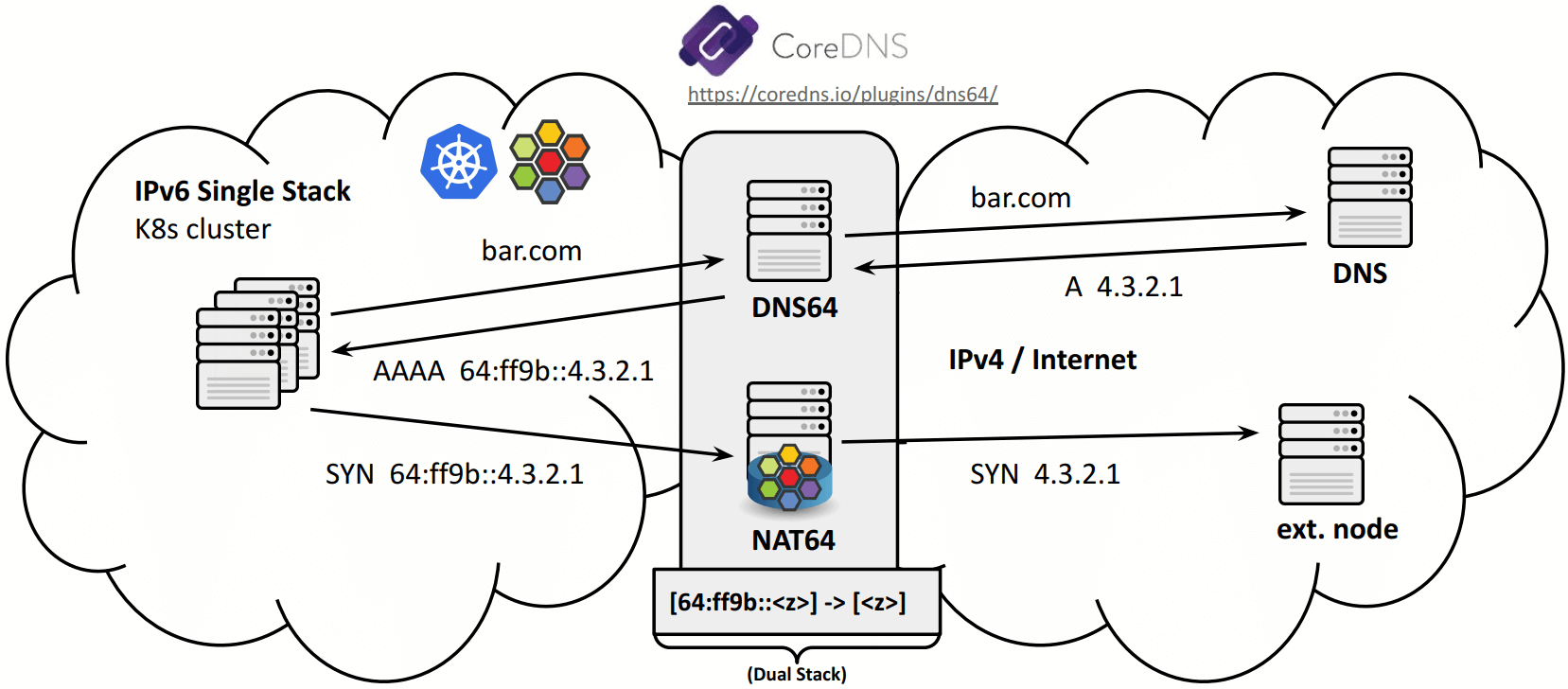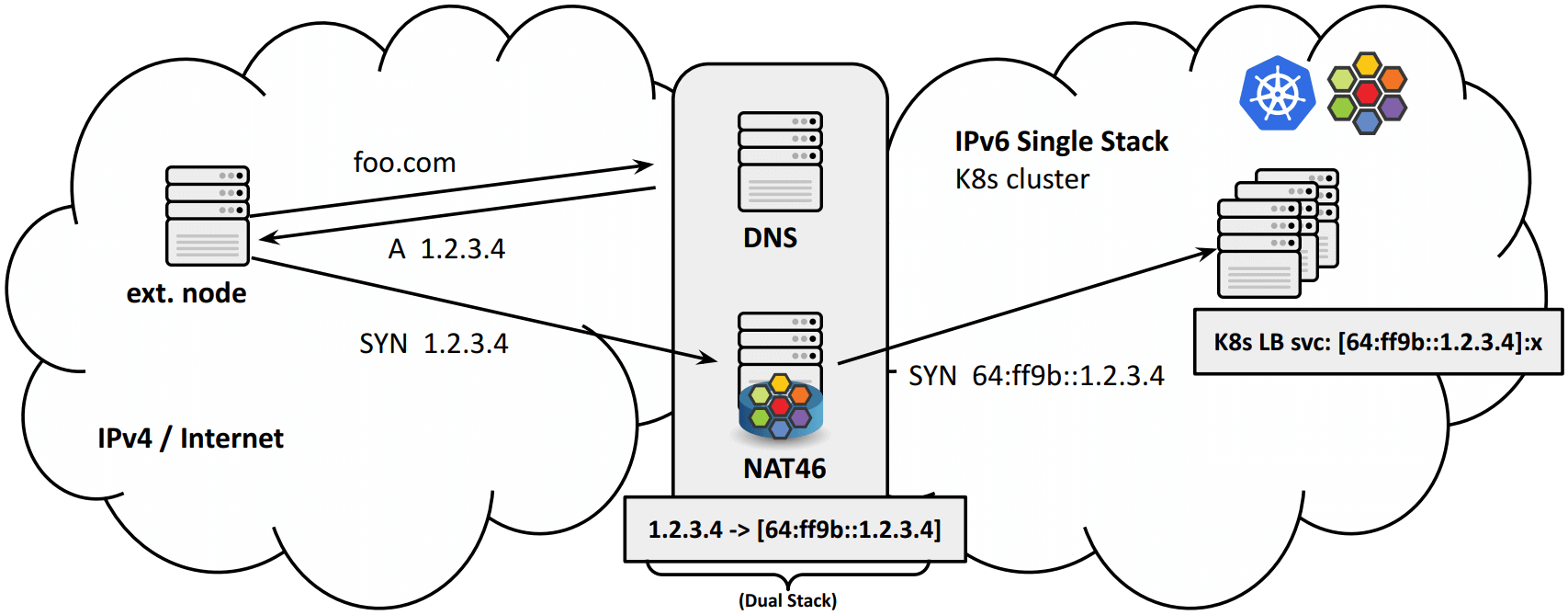 IPv6-only K8s 与传统 IPv4 服务的对接,使用的是 NAT46/NAT64,