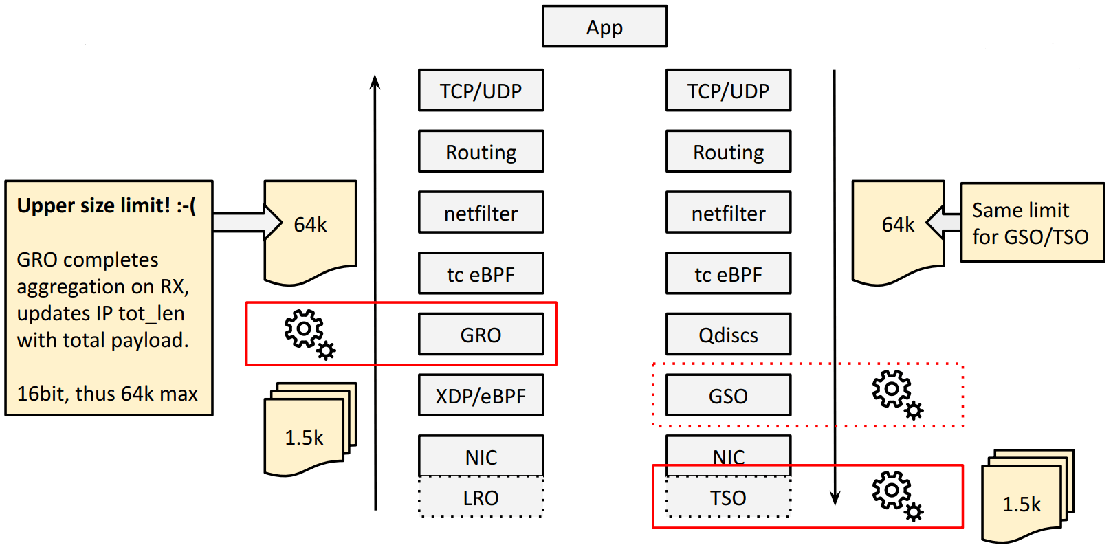 TX 方向的 TSO 也有一样的限制。也就是说,使用 IPv4,我们在 TX/RX 方向最大只能支持 64KB 的大包。