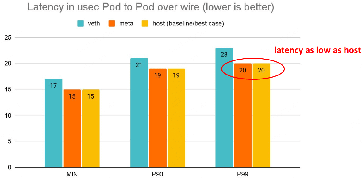 延迟更低,pod 的网络延迟已经接近 host network 应用的延迟。