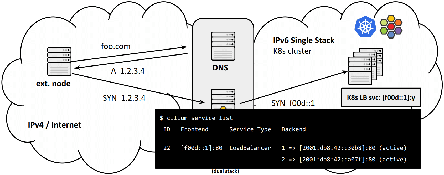 - 左上:承担 NAT46/64 功能的 Cilium L4LB 节点;