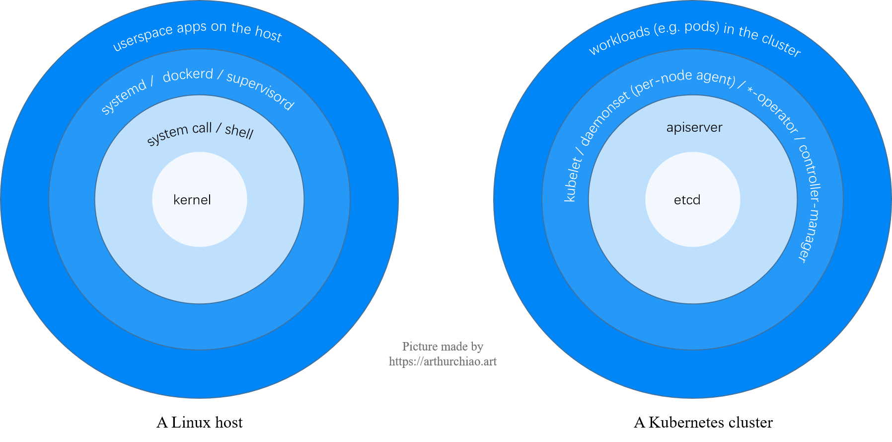 Fig 1. Anology: a Linux host and a Kubernetes cluster
