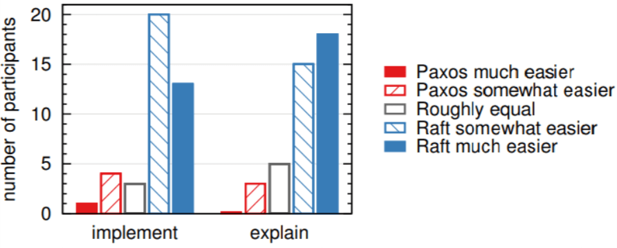 An overwhelming majority of participants reported Raft would be easier to implement and explain (33 of 41 for each question). However, these self-reported feelings may be less reliable than participants’ quiz scores, and participants may have been biased by knowledge of our hypothesis that Raft is easier to understand. A detailed discussion of the Raft user study is available at [31].